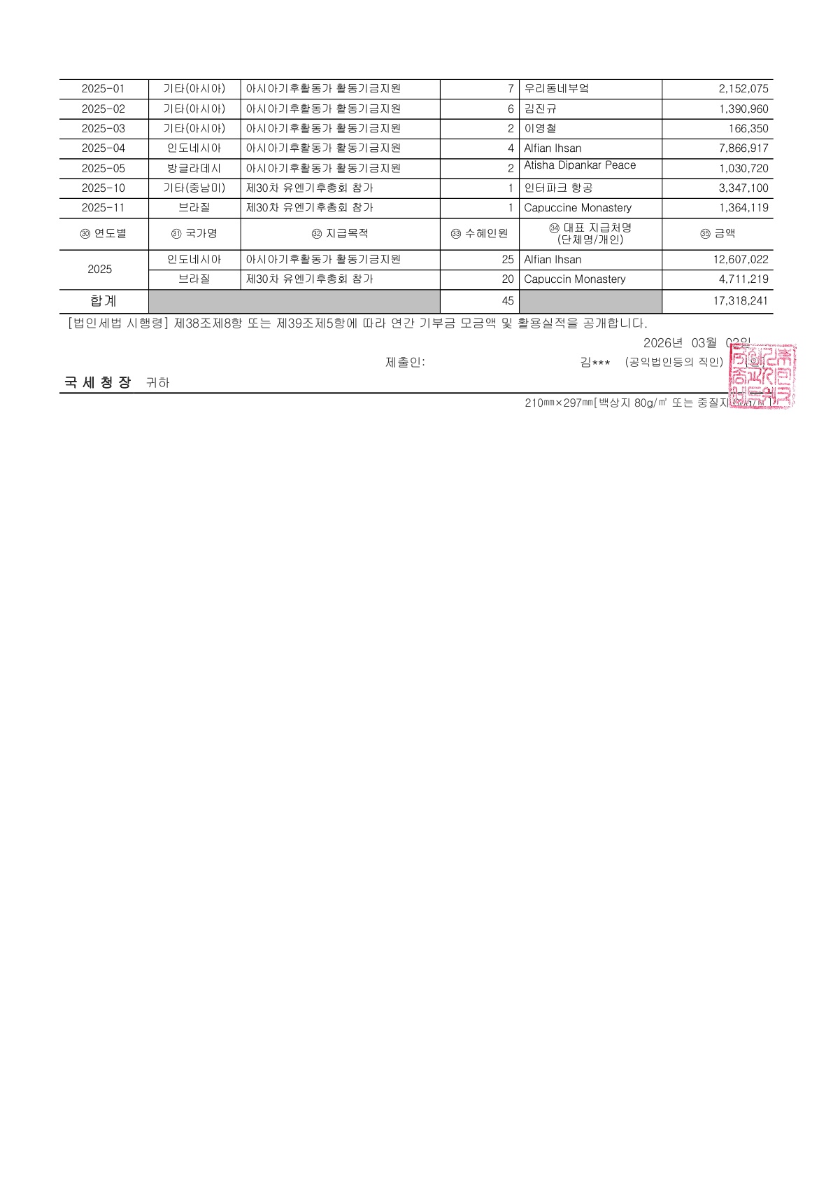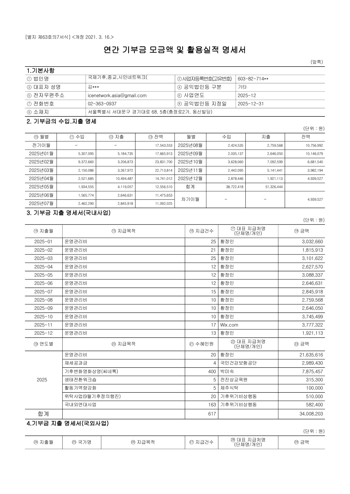2025년 연간 기부금 모금액 및 이용 실적 명세서보고서
