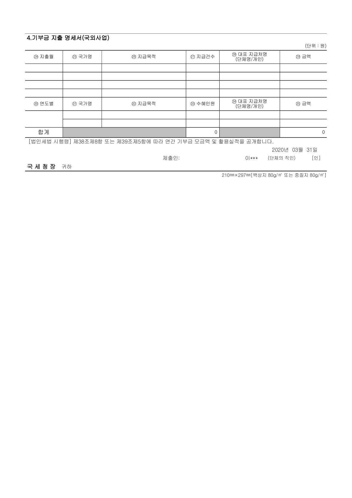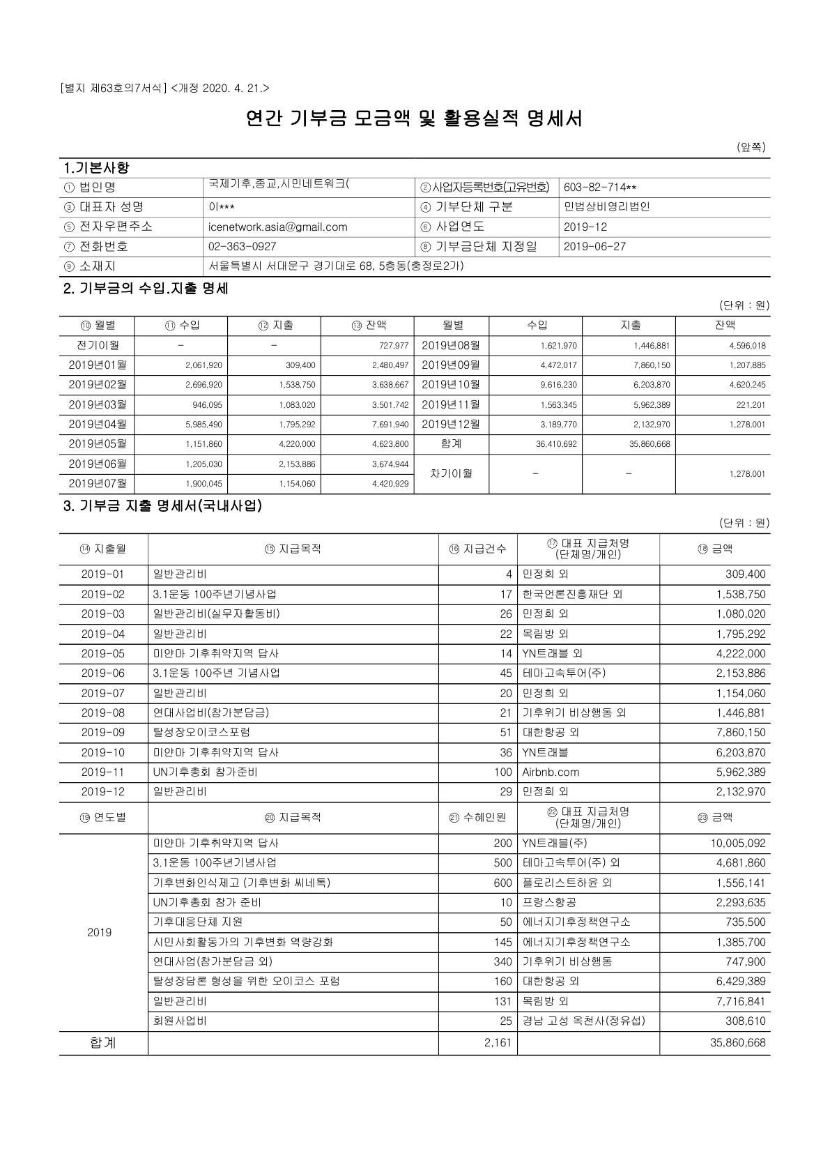• 2020년 결산보고, 연간 기부금 모금액 및 활용실적 명세서