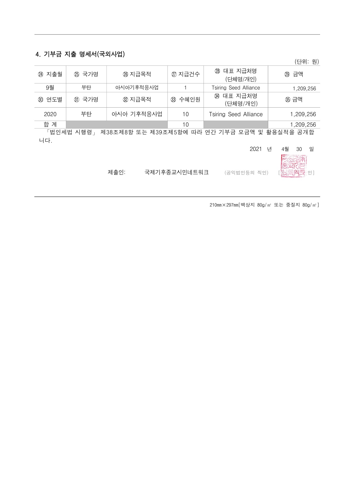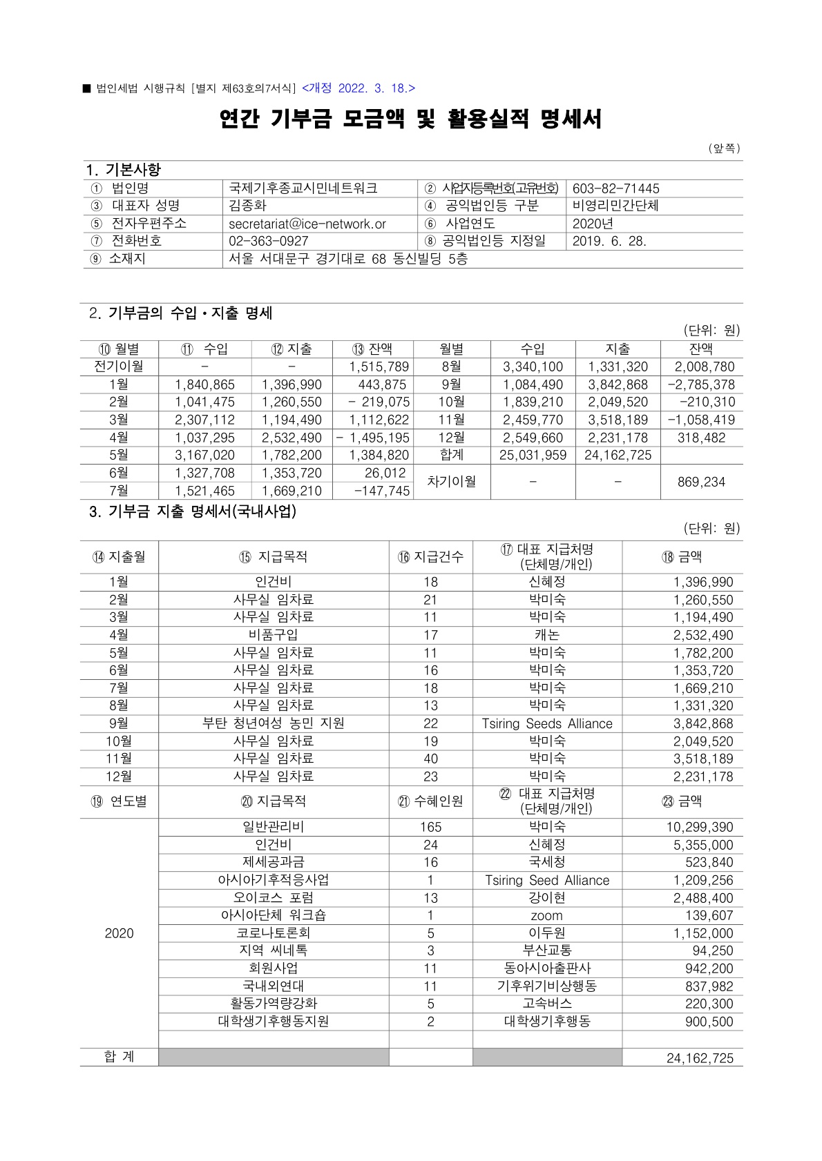 2020년 결산보고, 연간 기부금 모금액 및 활용실적 명세서