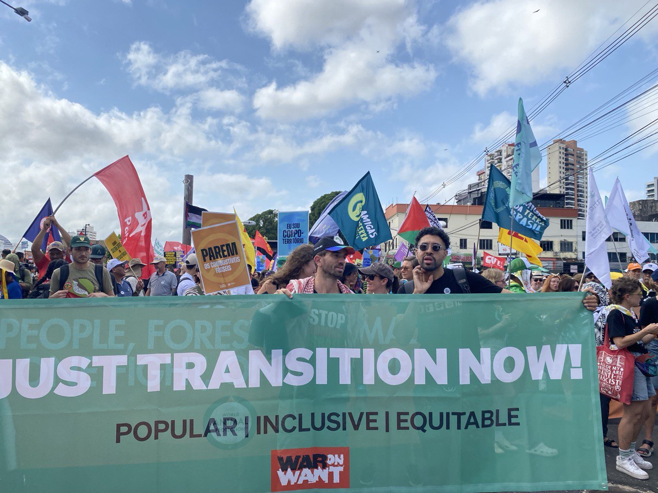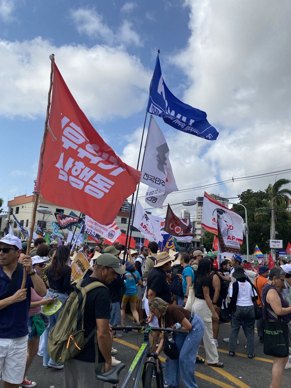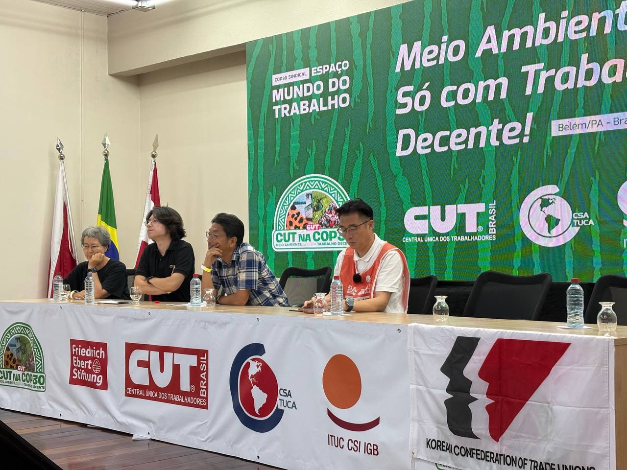 11월 15일 민중 정상회의가 주관하는 대규모 기후정의 행진이 진행되었는데 수천여 명의 선주민과 농지를 소유하지 못한 농민들이 많이 참가해 눈길을 끌었습니다. 유엔기후총회에 참석한 옵저버 NGO, 노동조합, 환경운동가 등 행진 참여 인원은 7만여 명에 이르렀습니다. 매년 9월 한국에서 개최되는 기후정의행진과 달리 발언자를 세우는 무대나 본 집회가 없고, 자유롭게 참여할 수 있는 행진이었습니다. 행진을 마친 11월 15일 오후에는 파라대학에서 민주노총과 브라질 노총이 공동 주관한 정의로운 전환 세션이 있었고, 한국의 비정규직발전노동자협의회와 금속노조, 플랜1.5, ICE네트워크가 발표를 맡아, 한국의 기후운동 현황과 공공 재생에너지 전환운동, 한국정부의 기후정책 등을 다뤘습니다.